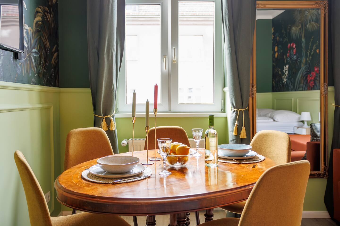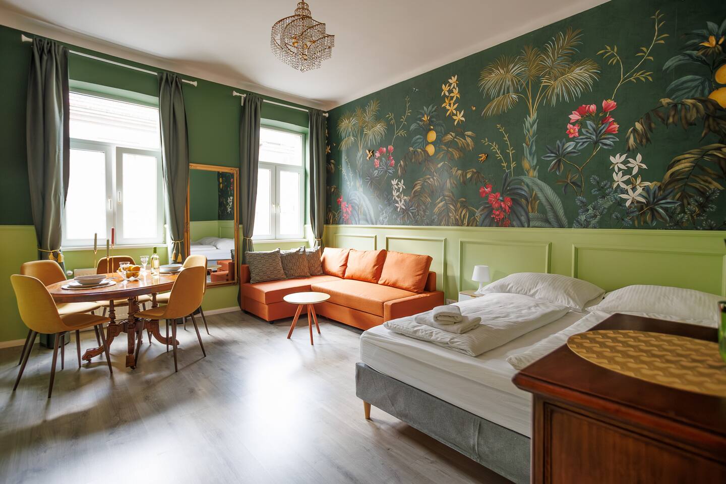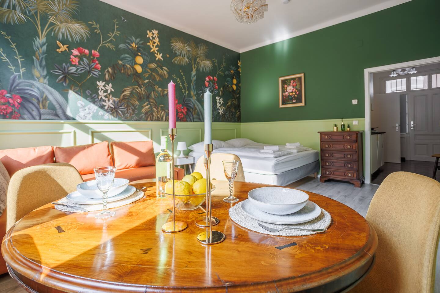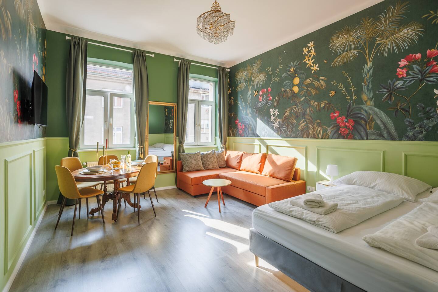 Die Wohnung befindet sich im 3.Stock ohne Lift. 2 min von Garage, Supermarkt und Westbahnhof entfernt. Von dort bist du mit der U3 in 6 Minuten am Stephansplatz Der offene Wohnbereich ist im klassischen Wiener Stil gestaltet mit Doppelbett (1,80x2m), bequemen Schlafsofa, einem Stockbett und Smart-TV. Ein getrennter Raum mit einem weiteren Stockbett ist ideal für Gruppen. In der voll ausgestatteten Küche inkl Nespresso-Maschine kannst du unsere Wiener Rezepte austesten.